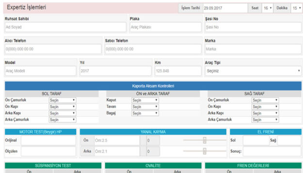 Araç ekspertiz yazılımı ekspertiz firmlarını ekspertiz raporunu istediği şekilde çıkarta bilmesi için hazırlanmıştır İçerik olarak ; Motor Kontrolleri Fren Testi Süspansiyon Kontrolleri İç Ve Dış Kontroller Otomotik Sanzıman Elektronik Test Konrolleri Alt/Ön Mekanik Kontroller Kaporta Ve Boya Kontrollerini Dyno test Kontrolu Liste halinde müşteriye evrak oluşturacak Şekilde  içerik hazırlanmıştır